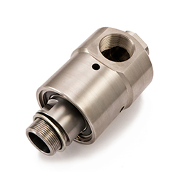 當(dāng)接頭在無液體流量時(shí),密封環(huán)面并不接觸,轉(zhuǎn)子幾乎沒有任何摩擦。當(dāng)有冷卻液輸入,就會(huì)因流體流量產(chǎn)生一個(gè)輕的壓力壓緊密封面的彈性O(shè)形圈,在操作剛起動(dòng)和結(jié)束時(shí),密封處可能會(huì)有少量冷卻液滴落最終溢出及密封面,保證沒有液體泄漏。而流量停止則O形圈壓力釋放,密封環(huán)面自動(dòng)分離。在操作剛結(jié)束時(shí),密封處可能會(huì)有少量冷卻液或水滴落最終溢出。如果此情況發(fā)生,溢出的冷卻也將會(huì)經(jīng)過迷宮式密封環(huán),再由排泄孔排出。所有零部件均為抗氧化材料,工作中允許使用純水。